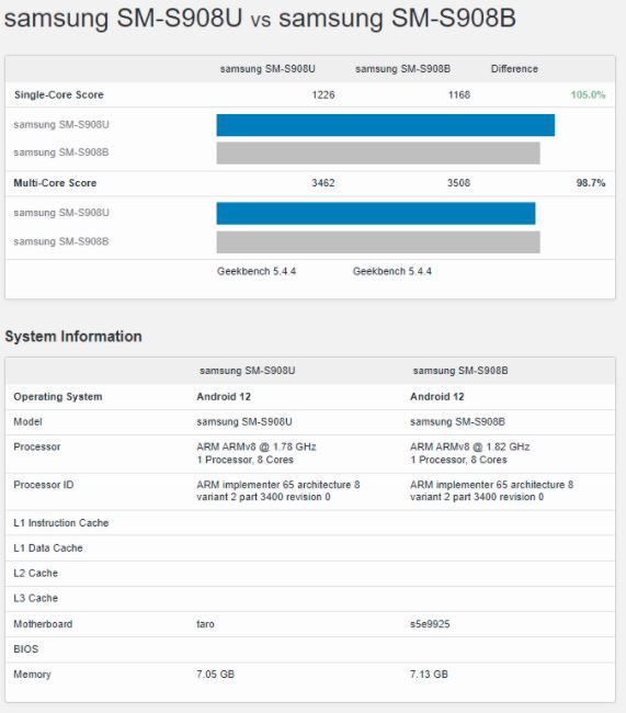 U nedavnom izvješću PhoneArena, nadolazeća Snapdragon 8 Gen 1 varijanta Samsung Galaxy S22 Ultra (kodno ime Samsung SM-S908U) suprotstavljena je varijantama Galaxy S22 Ultra Exynos 2200 (kodno ime Samsung SM-S908B) na temelju Geekbench rezultata dva SoC-a varijante. Podaci korišteni u usporedbi su najviši rezultati za obje SoC varijante i rezultati su prilično iznenađujući.